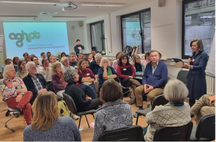 Im Anschluss führte Manfred Thielen (Vorstandsmitglied der AGHPT) in die Tagung ein und ordnete sie politisch und berufspolitisch ein. Er benannte zentrale Essentials Humanistischer Psychotherapie, darunter ein humanistisches Menschenbild, die Orientierung am Erleben im Hier-und-Jetzt, die Bedeutung der therapeutischen Beziehung sowie die Förderung von Autonomie, Selbstverantwortung und Entwicklung.